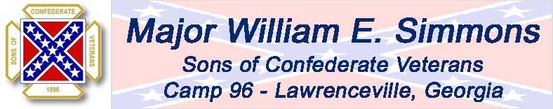 After much research, during the regular Camp meeting of 25 January 1999, a motion was made and passed to name the camp for Major William E. Simmons. Major Simmons was a native Lawrenceville War between the States hero and prominent citizen thereafter. He was a Major in the 3rd Battallion of the Georgia Sharpshooters, Confederate States Army and is buried inthe historic Shadow Lawn Cemetery in Lawrenceville, Ga.